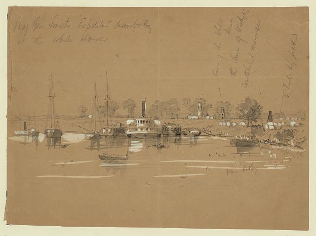 | "Maj Gen Smith's Expedition disembarks at the White House," sketch by William Waud, May 30, 1864. Library of Congress. |